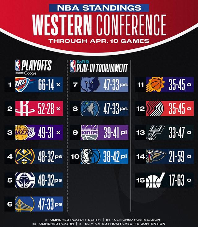 勇士、灰熊、森林狼战绩相同,勇士因三队交手战绩占优反超灰熊至第六,灰熊第七,森林狼仍居第八。